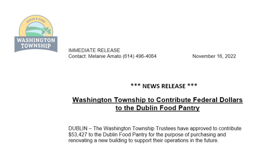 DUBLIN – The Washington Township Trustees have approved to contribute $53,427 to the Dublin Food Pantry for the purpose of purchasing and renovating a new building to support their operations in the future.